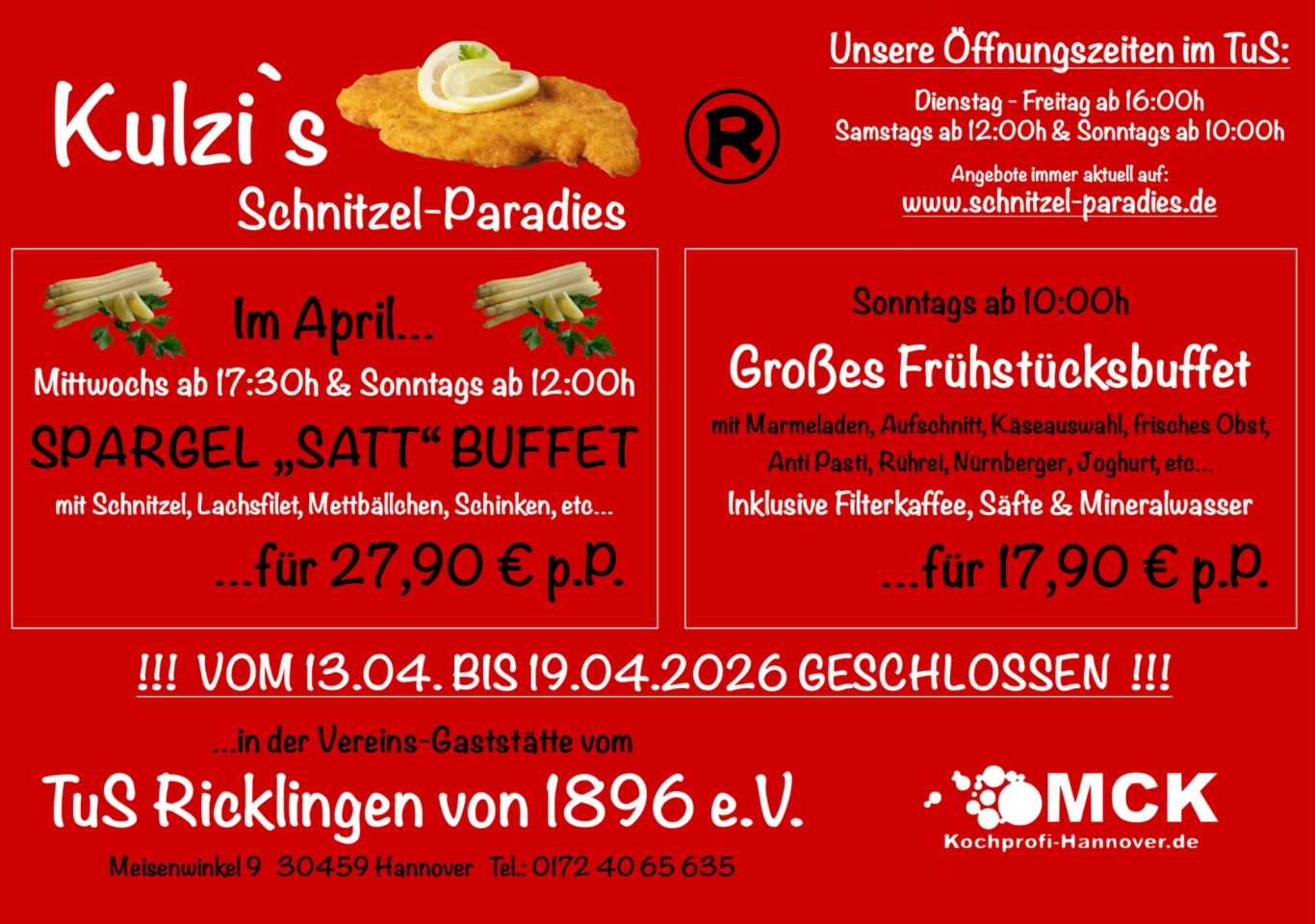 Wir würden uns freuen, euch in der Vereins-Gaststätte des TuS Ricklingen im Meisenwinkel 9 begrüßen zu dürfen.